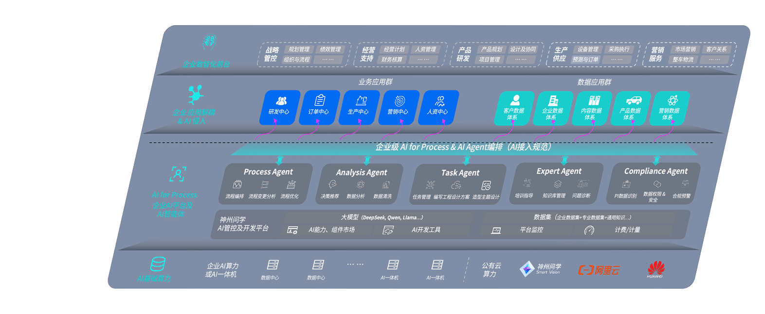 端到端的一站式AI工作空间深度融合了从企业战略规划到日常经营的全流程业务板块,,,,定向解决车企内部领域多、、部门多、、、、链条长、、、场景碎片化等难题,,,,支持车企快速构建以AI为核心的生产力写作体系,,,,实现任务执行与AI能力的无缝集成与交互