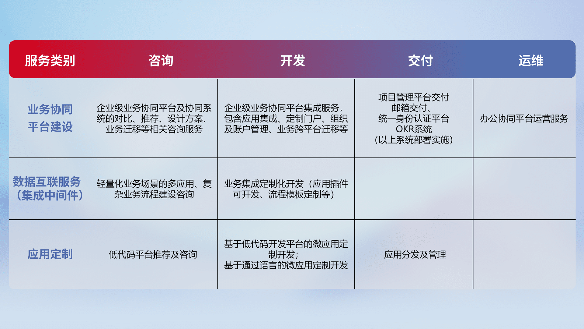 针对钉钉、、企微、、、、IDaas等平台级产品提供产品的规划、、方案、、交付、、、、定制化开发等服务,,,实现如统一协同办公、、、智能客户服务、、、、混合会议管理、、、智能数据查询、、、等业务场景,,实现数字化转型。。